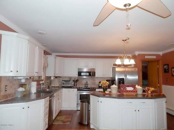 The kitchen is a chef’s dream, with custom cabinetry, an oversized island, a tiled backsplash, and stainless appliances, including a convection oven. The kitchen flows easily into the sunroom for large family gatherings.