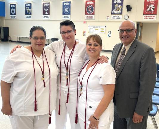 Three Wayne Memorial Hospital employees who took advantage of a tuition-paid program offered by the hospital graduated on June 9 as Practical Nurses. Wayne Memorial CEO James Pettinato, participated in the pinning ceremony at the Career Technology Center of Lackawanna County (CTCLC). The pinning signifies the completion of a level of education and officially welcomes the graduates into the profession of Nursing.