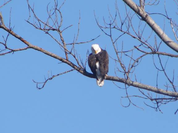 The Dingmans Ferry Access was open and had over 100 white-throated sparrows foraging near the bridge toll booth feeders. An adult eagle was at the Dingmans Cemetery and flew toward the river. We checked the mile marker 16 nest site and discovered that a second nest had been constructed above the previous one. An adult eagle was in the upper nest. The mile marker 17 nest site is no longer, what’s left of it is in shambles; however, an adult eagle was perched beneath it. No luck at Milford Beach. We checked the nest near the Pierce House: no eagles. From the Kittatinny campground pull-over we spotted an adult eagle perched above us on the ridge. No eagles at the DV high school or behind the Best Western. Our next stop was the Riverview restaurant near where PA, NJ, and NY converge and drew a blank.